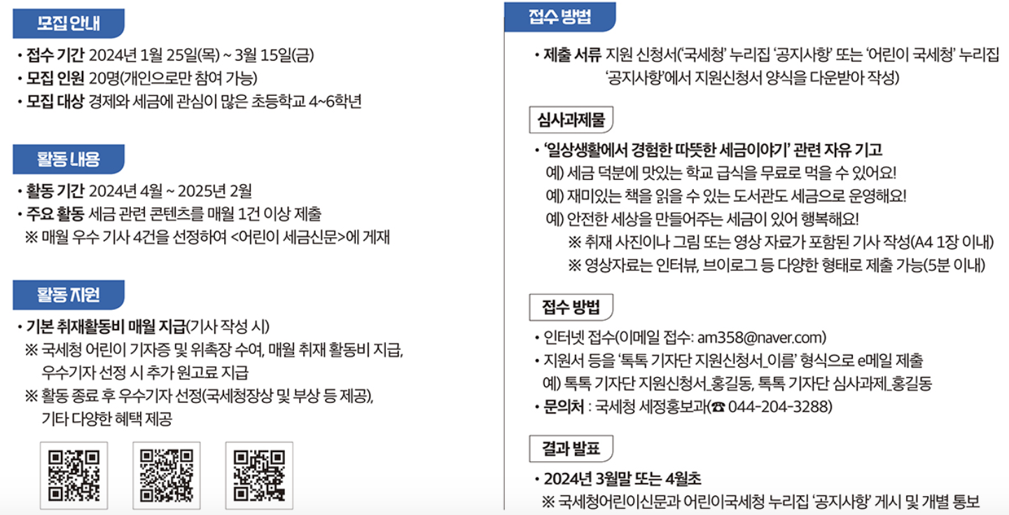 아래는 국세청 톡톡 어린이 기자단 모집에 관한 내용을 정리해두었으니 많은 참고 부탁드립니다.