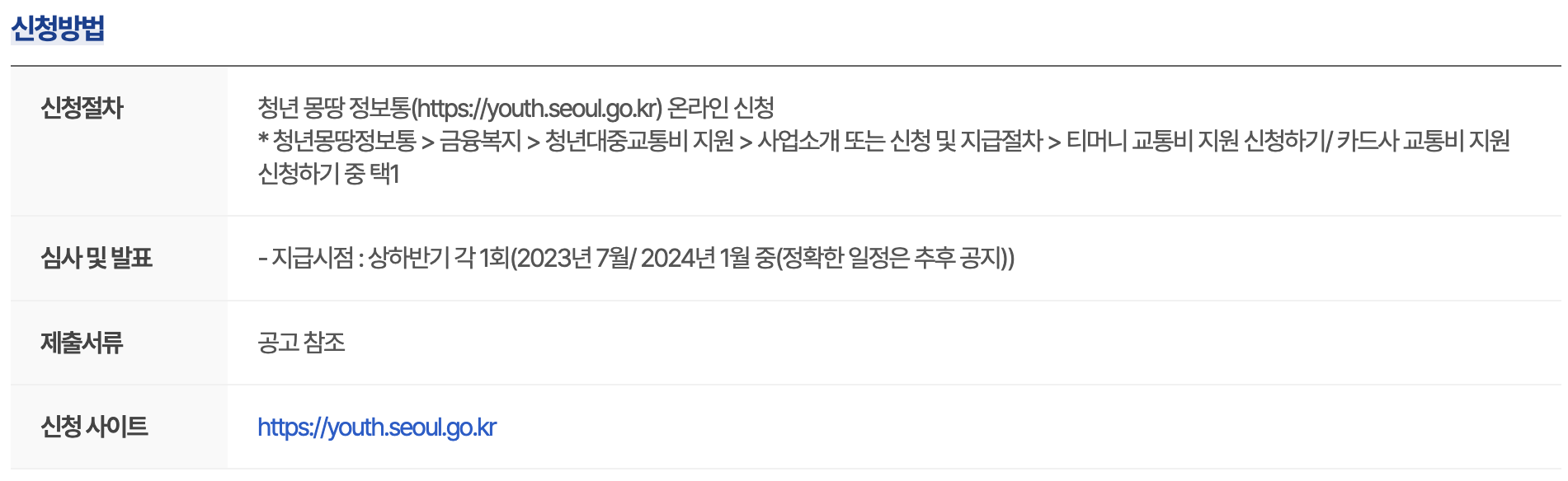 서울시청 미래청년 기획단에서 주관을 하고있으며 청소년기에서 청년기로 이행하며 사회에 첫발을 내딛는 청년들(만19~24세)의 교통비 완화 및 이동권 보장을 위한 대중교통비 지원 정책인데요. 등록한 교통카드 이용금액의 20%를 지원하며, 연 최대 10만원 한도의 금액을 지원받게됩니다. 이제 막 성인이 되어 대학 또는 취업을 하는 청년들에게는 큰 금액은 아니지만 무시할 수도 없는 금액이기에 해당 조건이 맞는 청년들이시라면 꼭 신청하셔서 혜택 놓치지 않으셨으면 좋겠습니다.