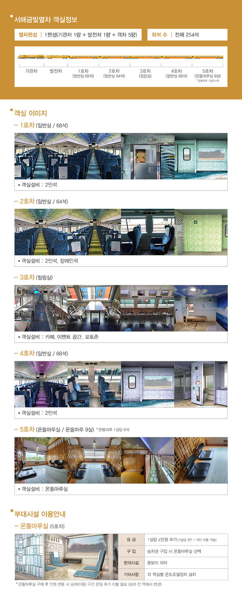 객실 정보 서해금빛열차는 총 5개의 객실로 구성되어 있습니다. 각 객실은 독특한 테마와 디자인으로 꾸며져 있어 여행의 즐거움을 더해줍니다.
