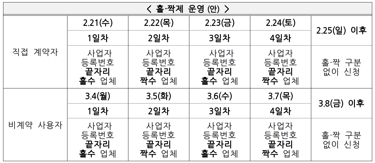 - (홀·짝제 운영) 원활한 신청을 위해 접수 개시 후 첫 4일간* 사업자등록번호 끝자리 기준 홀·짝제 시행