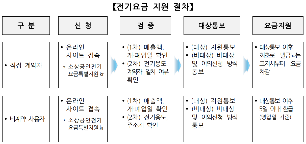 - (지원) 직접계약자는 대상자 통지 이후 최초로 발행되는 전기요금 고지서부터 전기요금 차감이 적용되며, 비계약사용자는 대상자 통지 후 5일 이내 (영업일 기준) 전기요금 납부금액 환급