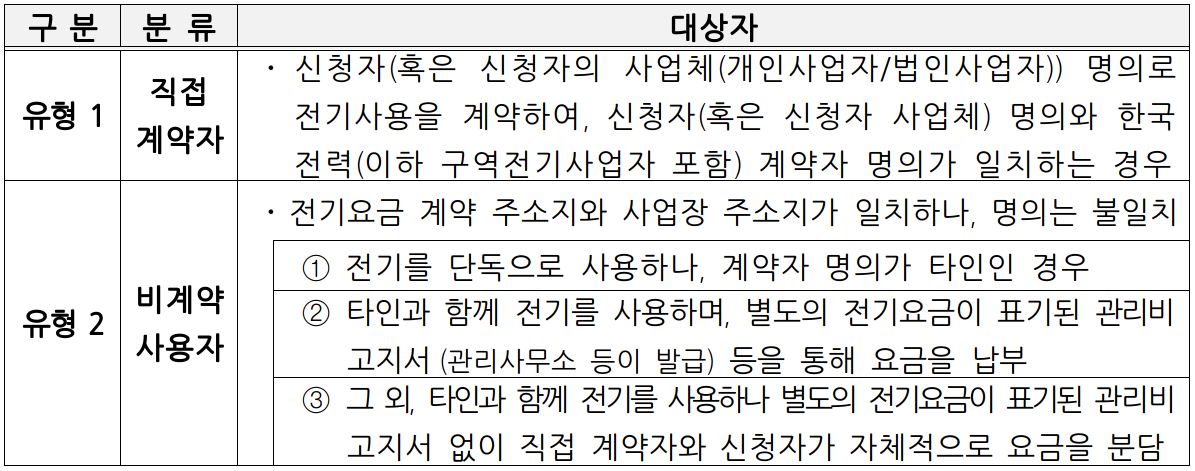 * 신청자명(대표자명), 사업자등록번호, 사업장 주소지, 사업장에 적용되는 전기요금 고객번호 등 비계약 사용자 유형별 제출서류 (안)